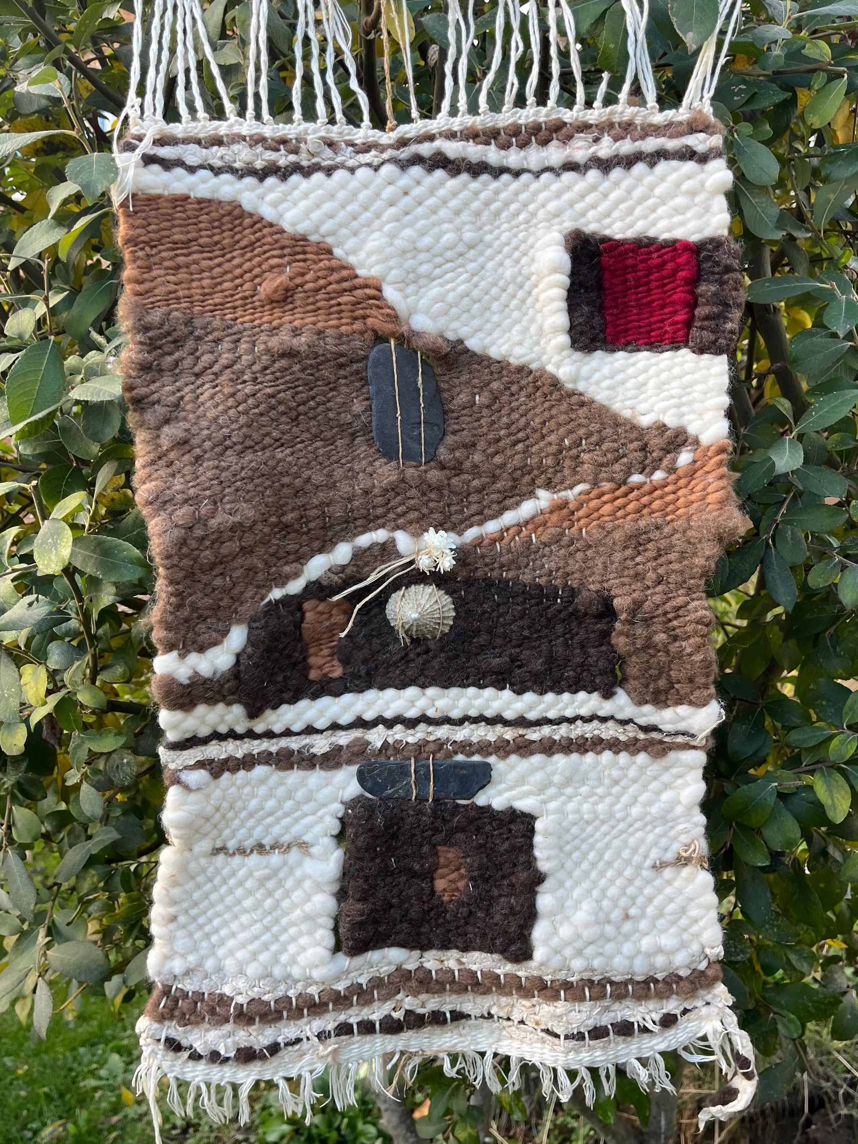 Discover handcrafted woven wall hangings by Michaela Cordes, crafted from natural hand-spun wool and botanical finds. Each piece is created with intention for protection, healing, and meditation, adding a touch of calm and serenity to your living space.